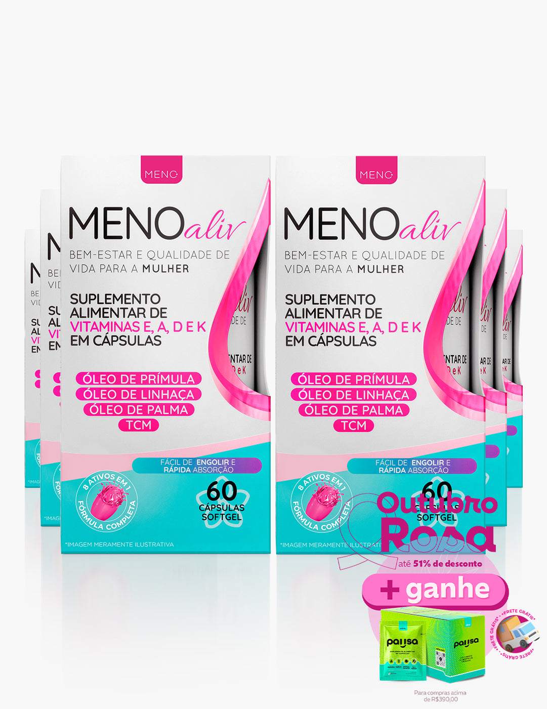 O Meno Aliv é composto por óleo de linhaça, óleo de prímula, óleo de palma, TCM puro e vitaminas A, D, E e K.